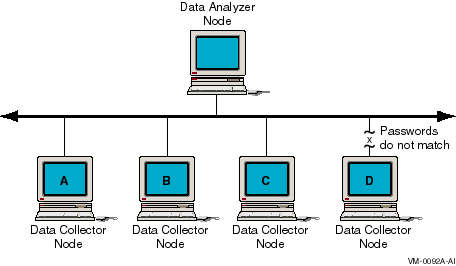 For monitoring to take place, the password on a Data Analyzer node must match the password section of the security triplet on each OpenVMS Data Collector node. OpenVMS Data Collectors also impose other security measures, which are explained in Section 1.3.2.