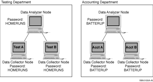 As shown in Figure 1-4, the Testing Department's Data Analyzer, whose password is HOMERUNS, can access only OpenVMS Data Collector nodes with the HOMERUNS password as part of their security triplets. The same is true of the Accounting Department's Data Analyzer, whose password is BATTERUP; it can access only OpenVMS Data Collector nodes with the BATTERUP password as part of their security triplets.