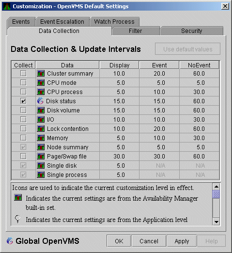 For OpenVMS nodes, if you want background data collection (and the associated event detection), you must turn on data collection for each type of data you want to collect. On Windows nodes, background data collection is always enabled and cannot be turned off.