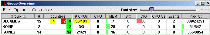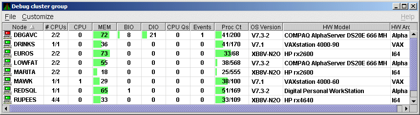 Additional summary information about the entire group is on the group line. CPU, MEM, BIO, and DIO numbers are averages. The rest of the number are totals for all of the nodes in the group.