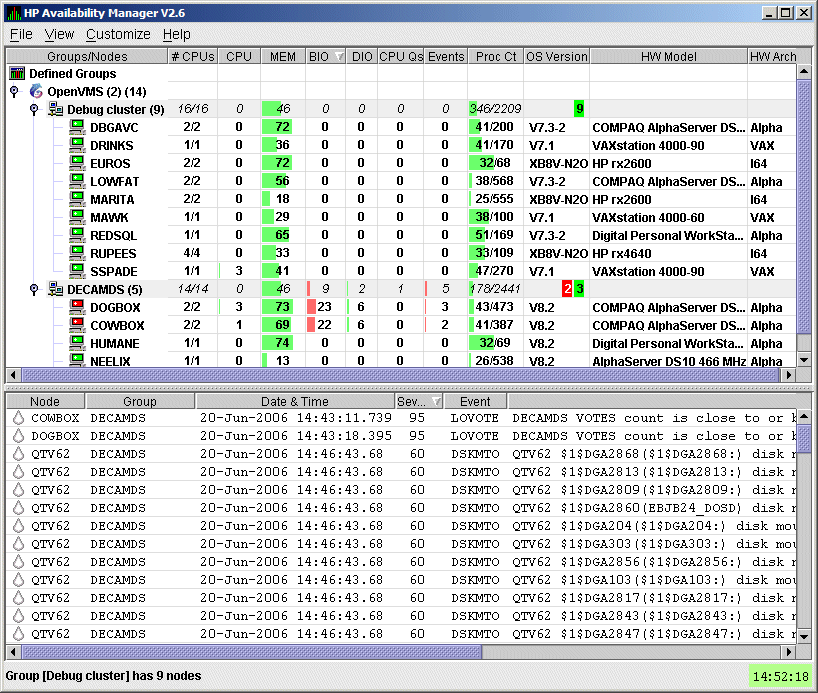 the Data Analyzer on an OpenVMS node and a Windows node.