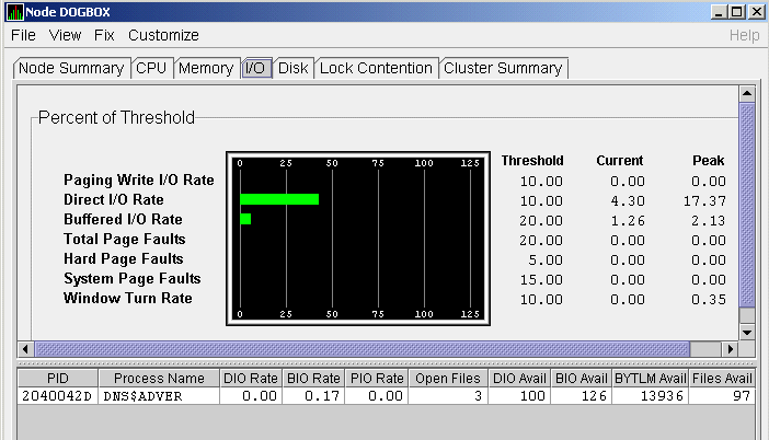 Current and peak values are listed for each type of I/O. Values that exceed thresholds set by the events indicated in the table are displayed in red on the screen. Appendix B describes OpenVMS and Windows events.