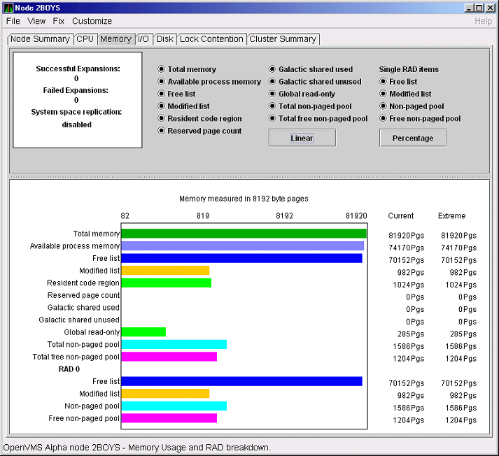 To the right of the box is a list of system memory data that is displayed in the bar graphs at the bottom of the page. You can toggle these data items on or off (that is, to display them as bar graphs). You can also click a small box to choose between Linear and Logarithmic bar graph displays.