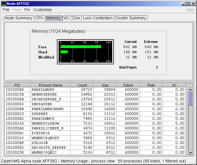 | Available process memory | Amount of total physical memory available to processes. This is the total memory minus memory allocated to OpenVMS. |