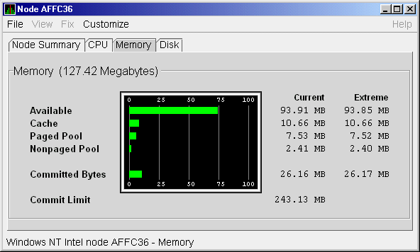 The graph in the top pane of Figure 3-10 shows memory distribution (Free, Used, and Modified) as absolute values, in megabytes of memory. Current and extreme values are also listed for each type of memory distribution. (Free memory uses the lowest seen value as its extreme.) Bad Pages show the number of pages that the operating system has marked as bad.