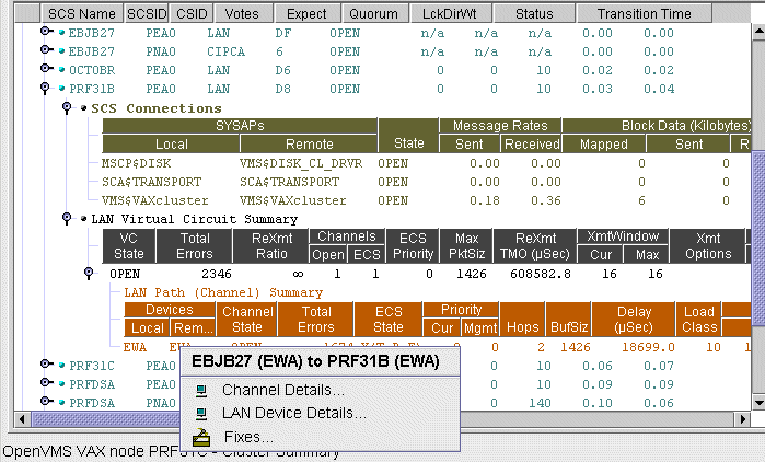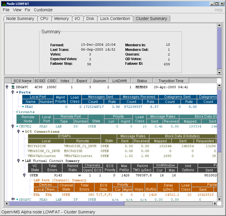 Currently, this feature is available only for LAN virtual circuits. VC Summary displays for other cluster interconnects such as CI might be available in the future. When other interconnects are supported, the interconnect type will be displayed at the beginning of the line---for example, CI Virtual Circuit Summary---and the associated heading will have interconnect-specific data items.