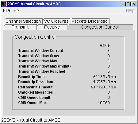 | Transmit Window Current | Current value of the transmit window (or pipe quota). After a timeout, the pipe quota is reset to 1 to decrease network path congestion. The pipe quota is allowed to increase as quickly as acknowledgments are received. |