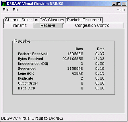 | Packets Received | (Raw) count and rate of packets received on the virtual circuit from the remote node, including both sequenced and unsequenced---that is, datagram packets and lone acknowledgments. |