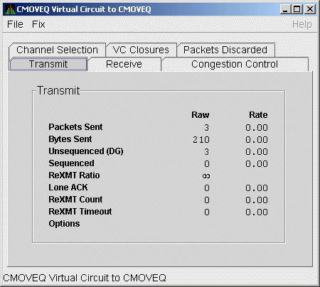 | Packets Sent | (Raw) count and rate of packets transmitted through the virtual circuit to the remote node, including both sequenced and unsequenced (channel control) packets and lone acknowledgments. |