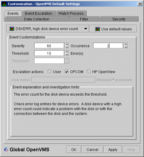 The sample Event Customization page indicates a threshold of 15 errors and an occurrence value of 2. This means that if the DSKERR event exceeds its threshold of 15 for two consecutive data collections, the DSKERR event is posted in the Event pane.