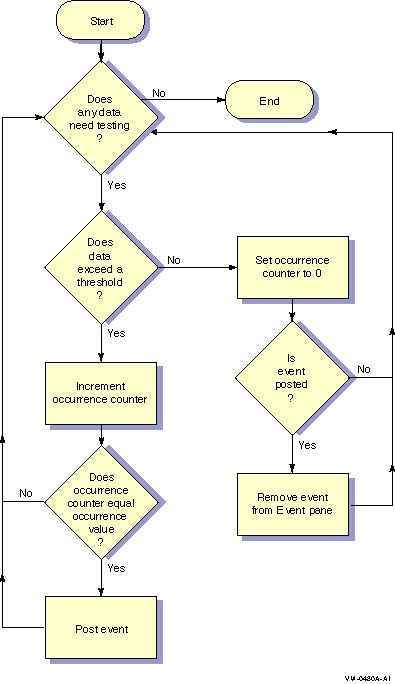 If, at any time during data collection, the data does not meet or exceed the threshold, the occurrence counter is set to zero, and the event is removed from the Event pane. Figure 5-3 depicts this sequence.
