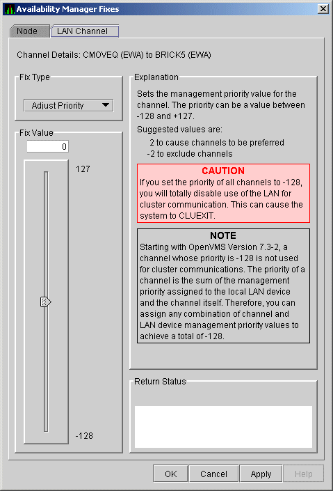 Starting with OpenVMS Version 7.3-2, a channel whose priority is -128 is not used for cluster communications. The priority of a channel is the sum of the management priority assigned to the local LAN device and the channel itself. Therefore, you can assign any combination of channel and LAN device management priority values to arrive at a total of -128.