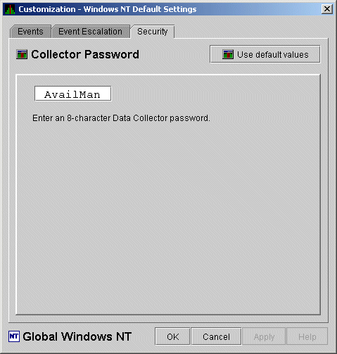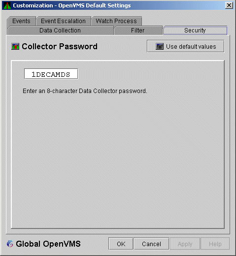 To change the default password for the Data Analyzer to use to access OpenVMS Data Collector nodes, enter a password of exactly 8 uppercase alphanumeric characters. The Availability Manager will use this password to access OpenVMS Data Collector nodes. This password must match the password that is part of the OpenVMS Data Collector security triplet ( Section 1.3.3).