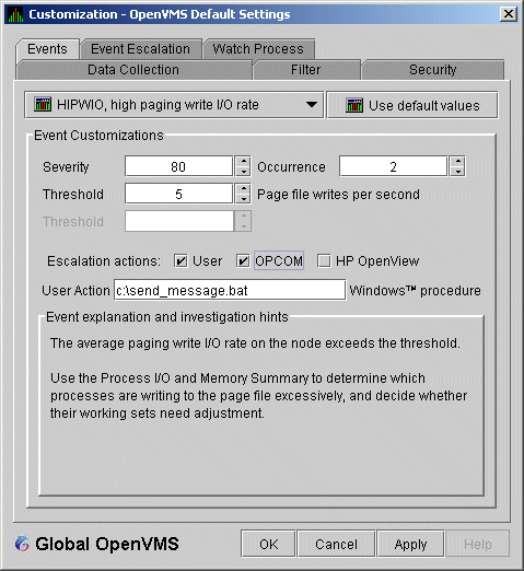For example, suppose page fault spikes are common in your environment, and the Availability Manager frequently signals intermittent HITTLP, total page fault rate is high events. You could change the event's occurrence value to 3, so that the total page fault rate must exceed the threshold for three consecutive collection intervals before being signaled to the event log. To avoid displaying insignificant events, you can customize an event so that the Availability Manager signals it only when it occurs continuously. |