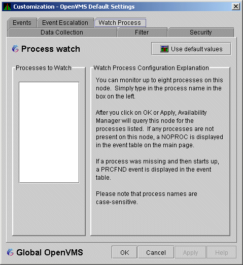 When you select Customize OpenVMS... on the Customize menu of the System Overview window, the Availability Manager displays a default customization page. On it is a tab marked Security, which, if you select it, displays the OpenVMS Security Customization page (Figure 7-21).