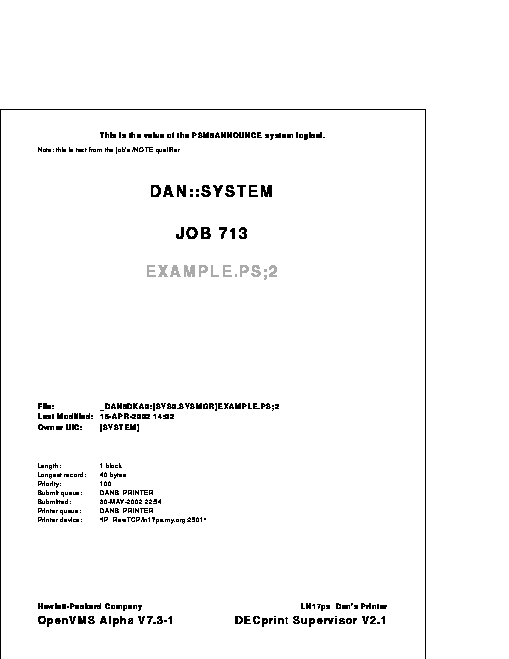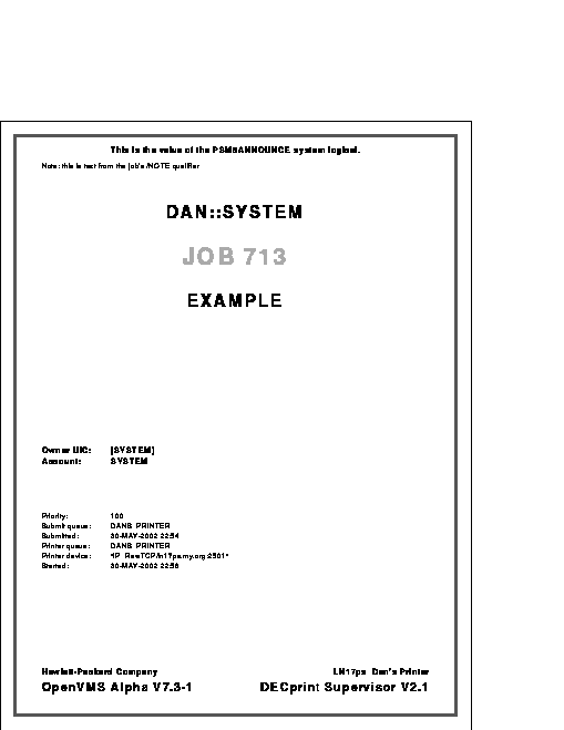 A job flag page looks like a job burst page without the border around the page. A job trailer page looks like a job flag page with the message "END OF JOB" printed at the top and with additional information listed for the job (for example, when it finished, which PRINT qualifiers and parameters were used, and how many pages were printed). File separation pages are differentiated from each other in an analagous fashion, and from job separation pages by the presence of file-specific information (for example, the file specification, file size, and modification time).