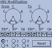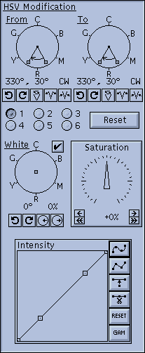 Modification tool. At the top of the window are a pair of circular controls that handle hue remapping. Lower down is a circular control that maps 'white' (and greys) to a specified color. There is also dial control that lets you saturate/desaturate the colors of the image. Finally, at the bottom there is a graph window that lets you modify intensity values via an arbitrary remapping function. |