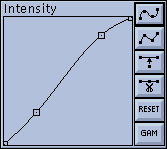 of the image, and get some unique effects. The Intensity graph is a function that lets you remap intensity values (the Value component in the HSV Colorspace) into other intensity values. The input and output values of this function both range from 0 to 255. The input values range along the x axis of this graph (the horizontal). For every input value (point along the x axis) there is a unique output value determined by the height of the graph at that point. In the graph's default state, the function is a straight line from bottom-left to top-right. In this case, each input value produces an equivalent output value, and the graph has no effect. |