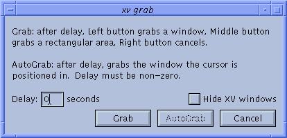 A delayed grab is very similar to a normal grab, except that xv will wait for the specified number of seconds, and then beep once to signify the start of the grab. You can then press the Left, Middle, or Right mouse buttons, as described above. To do a delayed grab, simply enter a non-zero number in the 'Delay' field, and press the Grab button in the xv grab dialog box.