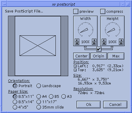 The xv postscript window lets you describe how your image should look when printed. You can set the paper size and the image size, position the image on the paper, and print in 'portrait' or 'landscape' mode.