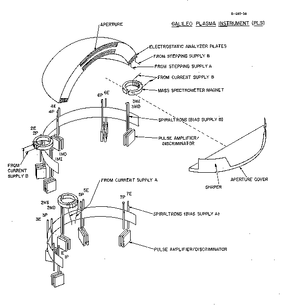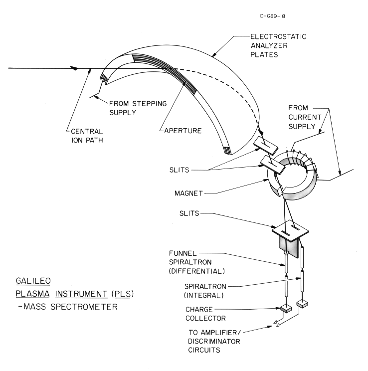 The spacecraft potential is expected to be important at the lower energy range of the analyzer. A quantitative assessment of anticipated spacecraft potentials is given by the Voyager plasma measurements. In the outer magnetosphere, typical Voyager spacecraft potentials were positive in the range of several volts to 10 V (Scudder et al., 1981). Because the plasmas are generally hot, temperatures ~keV, in the outer magnetosphere the plasma measurements should not be greatly impaired. On the other hand, in the highest density regions of the Io torus, Voyager spacecraft potentials were negative with magnitudes up to 25 V (Sittler and Strobel, 1987). In this region electron temperatures are tens of eV or less and the observations of thermal electron plasmas may be precluded if the Galileo spacecraft potential is similar. The energy range of the Galileo plasma instrument is sufficient to determine this spacecraft potential. Determination of the magnitude of the potential will have to await the in-situ observations. The potentials along the boom on which the plasma instrument is mounted and those of the spacecraft body will also affect the trajectories of low-energy particles as viewed by the plasma analyzer. This effect will have to be modeled in detail in order to determine the deflections of the observed angular distributions as a function of particle energy.