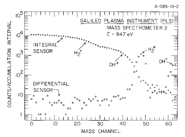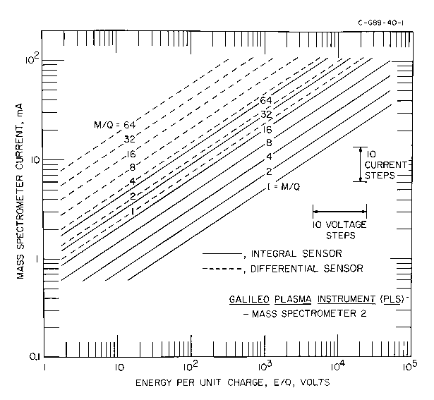 An example of the mass spectrometer performance taken from laboratory calibrations of the flight instrument is shown in Figure 6. The value for E/Q is 947 V for the two ions in the beam, H2+ and OH+. The sweeping of the ions from the integral sensor as a function of M/Q and mass channel (magnet current) is clearly evident. At higher mass channels (larger current) these ions are deflected sufficiently to be detected with the differential sensor. A summary of the measured performance of the miniature mass spectrometer as functions of M/Q, E/Q, and electromagnet current is given in Figure 7. The M/Q value for the integral sensor is taken at a fraction 0.5 of the undeflected responses. For a given current step of the mass spectrometer, the averaged FWHM for the three mass spectrometers in terms of ion energy is dE/E = 0.06. In general the differential channel is used for the detection of trace fluxes of light ions and the integral channel for abundant heavy ions in the Jovian magnetosphere. The mass resolutions of the mass spectrometers are M/dM = 4.2 at full-width at 50% responses (FWHM) for the differential sensors (MD) and M/dM approximately equal to 2 for the integral sensors (MI). This resolution has been chosen to allow identification of the species H+, H2+ (He++), He+, O++, O+, Na+, S+ and K+ with the MD sensors and H+, H2+ (He++), O++, O+, S+, and SO2+ with the MI sensors. The E/Q ranges vary with the M/Q of the ion species, e.g., for the MD sensors, 0.9 V to 20 kV for H+, 0.9 V to 3 kV for O+, and 0.9 V to 800 V for S+. For the MI sensors, these ranges are 10 V to 52 kV for H+, 0.9 V to 52 kV for O+, and 0.9 V to 14 kV for S+. The mass spectrometers cannot distinguish between two ions with the same M/Q, e.g., O+ and S++. The mass spectrometers are designed in part with the criterion that corotating SO2+ (M/Q = 64 amu, E/Q approximately equal to 2 kV) can be identified at Io's orbit.