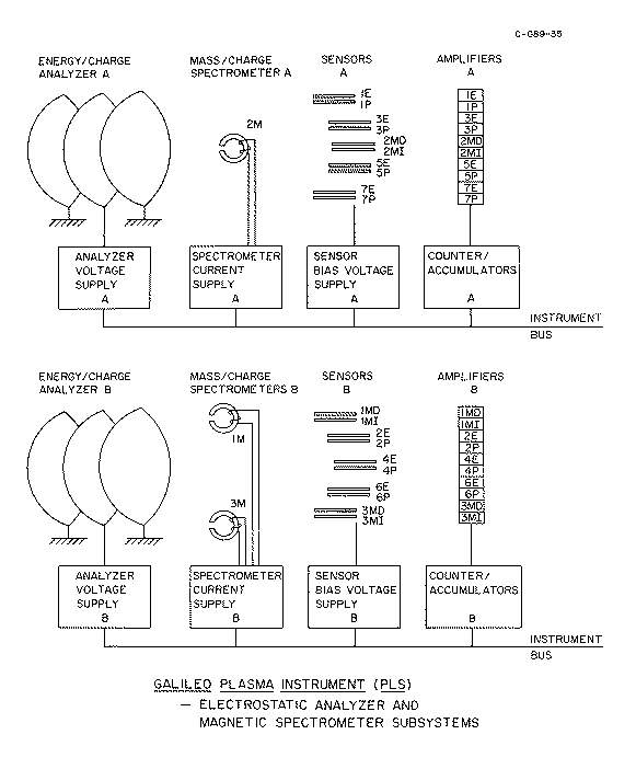 Considerable attention in the design of the instrument was directed toward minimizing the sensor responses to the intense fluxes of energetic electrons in the inner Jovian magnetosphere. The Spiraltrons are shielded in all directions by a minimum of 2.5 g cm-2 equivalent of aluminum. This corresponds to an electron range of ~5 MeV. In addition the Spiraltrons used for ion sensors are operated at a sufficiently low voltage that two or more initial secondary electrons at their entrance apertures are necessary to yield an electron pulse above the discriminator level of the amplifiers. This mode of operation reduces the sensor efficiency for the detection of ions by 50% (plus or minus 10%), with a corresponding decrease in the geometric factors cited in Table 1. Such operation of the sensors at bias voltages ~2400 V allows discrimination against detection of penetrating electrons. The omnidirectional geometric factors for detection of penetrating, > 5 MeV electrons are ~10-4 cm2 for the ion sensors with 1-mm apertures, and ~10-3 cm2 for the 3-mm ion sensors (see Table 1). The corresponding geometric factors for the Spiraltrons used in the electron analyzers are ~10-3 cm2. At the orbit of Io the electron intensities with E > 5 MeV are ~2 × 107 cm-2 s-1 (Van Allen, 1976). Thus the background counting rates are ~2 × 103, 2 × 104, and 2 × 104 counts/s for the 1-mm ion sensors, the 3-mm ion sensors, and the 1-mm electron sensors, respectively. For comparison, the sensor responses in the direction of flow (S+, 1000 cm-3, 50 eV, 100 km sec-1) are ~5 × 106 counts/s for the ion channels of the electrostatic analyzer and ~3 × 105 counts/s for the sensors in the mass spectrometer. The analyzer responses to electrons (e-, 1000 cm-3, 50 eV) are expected to be ~6 × 105 counts/s. The corresponding S/N ratios are 2500, 150 (I) and 15 (D), and 30 for the ion sensors, mass spectrometer sensors and electron sensors, respectively.