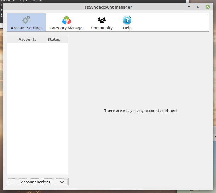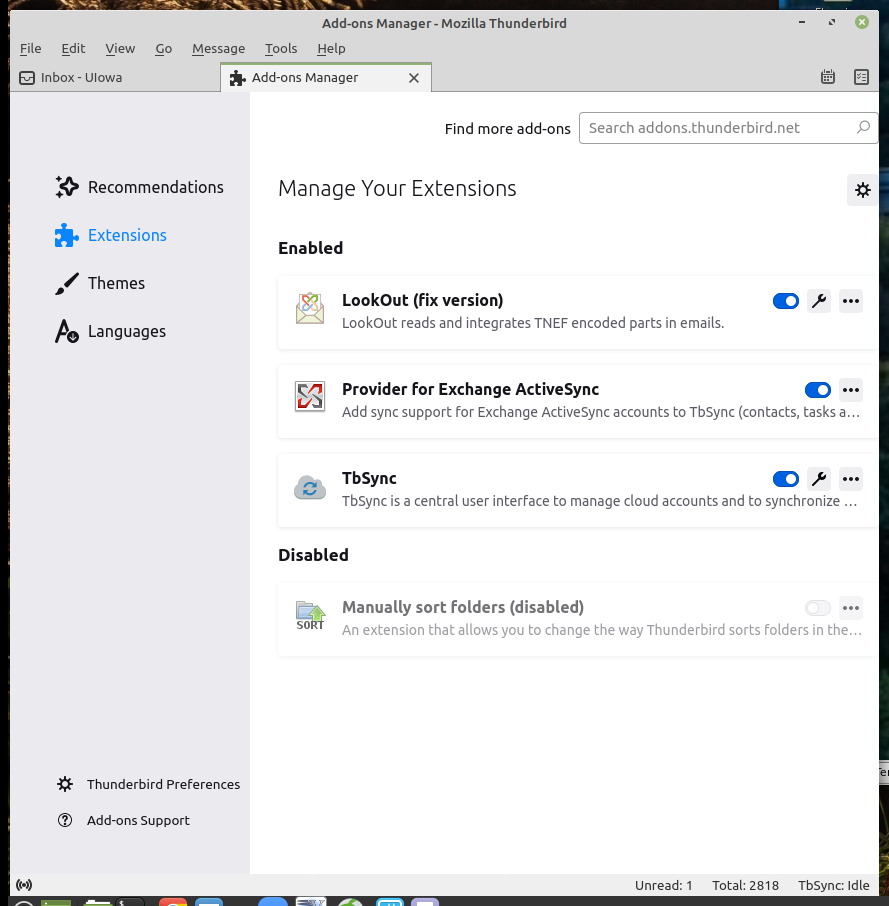 First, select "Add-ons and Themes" under the "hamburger" menu (three horizontal lines). Alternatively, follow "Tools" -> "Add-ons and Themes". The "Add-ons Manager" tab should appear. Search for and add two extensions, the first named "TbSync" and the second named "Provider for Exchange ActiveSync". When they're installed, the extensions should appear as in the screen shot below. Select the "wrench" icon next to "TbSync" to begin configuration.