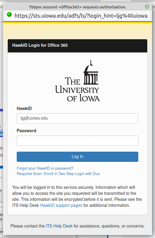 Assuming you've followed the previous instructions to enable access to UIowa Microsoft Exchange e-mail server from Thunderbird, you should also synchronize your calendar with Exchange ActiveSync. As of writing this guide, access to our Zimbra web interface is disabled, along with calendar access. However, if you've been using Thunderbird, you have a local copy of the calendar which can be used to sync with the Microsoft server. Expand the steps below to access instructions and click on the small screen shots to see larger versions.