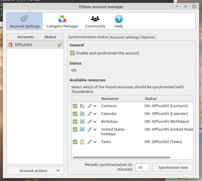 There should be an "Office365" (or whatever you named it) in the "Accounts" list of the "TbSync account manager" window as below. Check the "Enable and synchronize this account" box under the "Synchronization status" tab. A list of available calendar-like resources will appear. I recommend selecting each one individually, followed by clicking the "Synchronize now" button in the lower right corner.