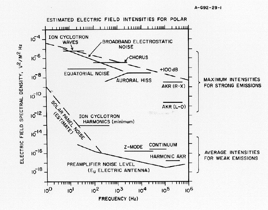 Figure 6: A plot showing the dynamic range of the PWI and the expected electric field spectral densities for a variety of plasma wave phenomena to be measured by PWI. The estimated spectral densities were derived using plasma wave measurements from the Dynamics Explorer Plasma Wave Instrument. The noise level of the Polar electric antenna was derived from signal sensitivity measurements of the electric antenna preamplifiers and boom buffers, supplied by EFI.