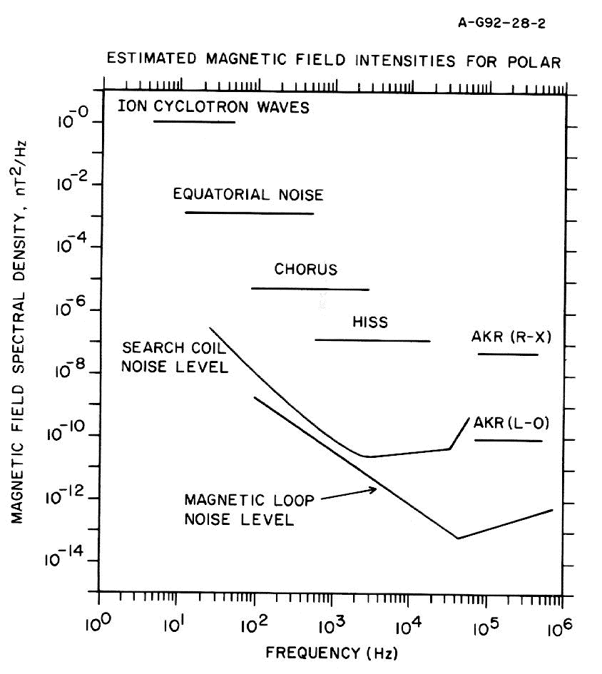 Figure 7: A plot showing the estimated noise levels for the Polar search coil and magnetic loop antennas and the expected magnetic field spectral densities for a variety of plasma wave phenomena to be measured by PWI. The estimated spectral densities were derived using plasma wave measurements from the Dynamics Explorer Plasma Wave Instrument. The noise levels of the Polar magnetic antennas were derived from noise sensitivity tests conducted at the Goddard Space Flight Center Magnetic Test Facility.