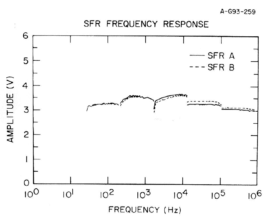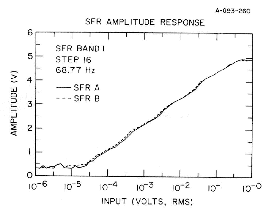 The MCA and SFR channels use a compressor with a piecewise-linear approximation to a logarithmic amplitude response. Over the full range of amplitudes, the response of each compressor consists of a series of five distinct linear segments that deviate somewhat from a true logarithmic response. Because the compressors have different amplitude sensitivity characteristics, the amplitude response of each compressor must be individually measured. The amplitude response of a typical logarithmic compressor is shown in Figure 8 for the middle step of the first SFR band at 69 Hz.
