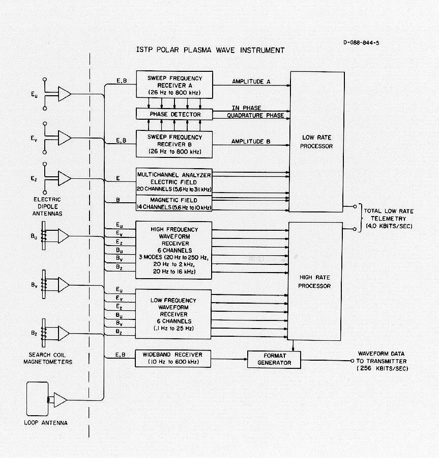 The instrumentation in the main electronics package consists of five receiver systems: a high-time resolution multichannel analyzer (MCA); a narrowband sweep frequency receiver (SFR); a high-frequency waveform receiver (HFWR); a low-frequency waveform receiver (LFWR); and a wideband receiver (WBR). The detailed characteristics of these receiver systems are listed in Table 4a and Table 4b. The receivers can be connected to the electric and magnetic antennas in various combinations by antenna selection switches as listed in Tables 4a and 4b. The sampling of the outputs from the various receiver systems is controlled by two microprocessor-based digital processing units. The Low-Rate Processor (LRP), which uses an 8085 microprocessor, is used to process signals from the SFR and MCA. The High-Rate Processor (HRP), which uses an 8086 microprocessor, is used to perform digital filter operations on data from the WBR. The HRP controls the operation of the WBR and includes a 3.4-megabit waveform capture memory for storage of the HFWR and LFWR waveform data. The LRP and HRP have independent data connections to the spacecraft to prevent complete disruption of the data output due to processor upsets. A photograph of the main electronics package is given in Figure 5.