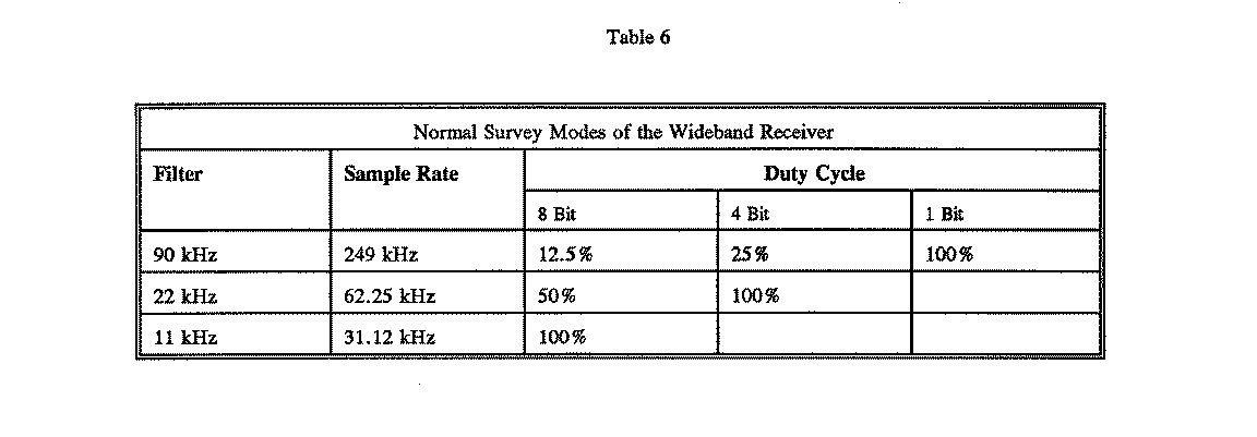 The WBR has three analog-to-digital conversion modes with 1-, 4-, and 8-bit resolution. Each mode adjusts the duty cycle in conjunction with the selected bandwidth to produce a constant output bit rate of 249 kilobits per second (kb/s) to the telemetry system. The default mode of the WBR is the 11- kHz bandwidth at baseband (0 kHz) with 8-bit conversion, which gives a 100% duty cycle. The conversion modes, sample rates and corresponding duty cycles for the three normal mode filters are listed in Table 6.