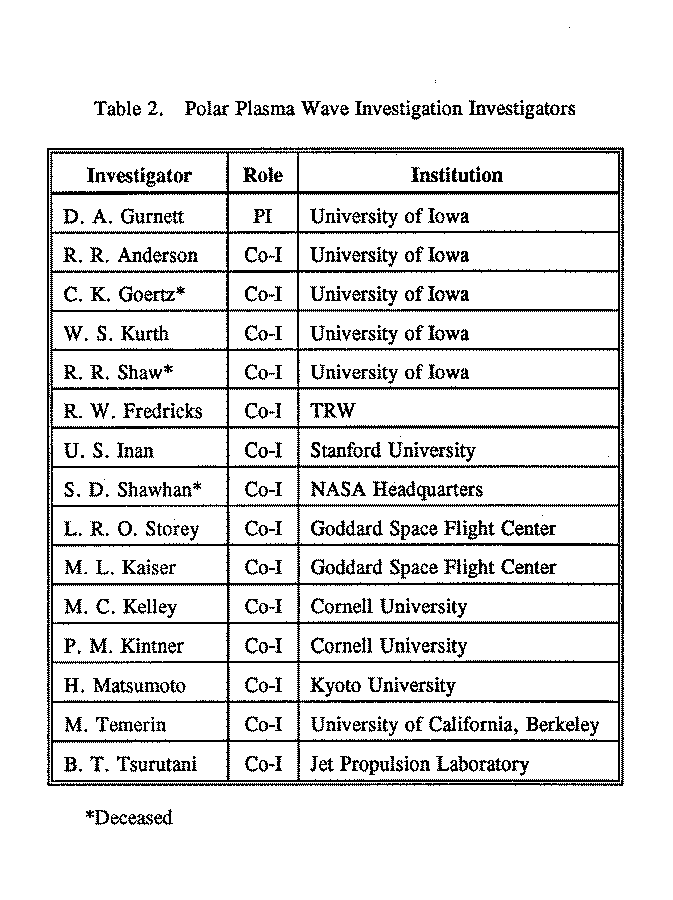 The advanced design of the Polar plasma wave instrument and the other instruments on the Polar spacecraft will allow us to investigate many specific questions that have been left unanswered. For example, to understand the exact mechanisms involved in the generation of auroral kilometric radiation closely coordinated wave and plasma measurements must be made as the spacecraft crosses the auroral field lines. It is not known, for example, whether a loss-cone [Wu and Lee, 1979] or an electrostatically trapped particle distribution [Louarn et al., 1990] is responsible for the growth of the auroral kilometric radiation. The high-resolution plasma measurements on Polar, in conjunction with the very detailed plasma wave measurements, should allow us to answer questions of this type. A list of the investigators and institutions participating in this investigation is given in Table 2.